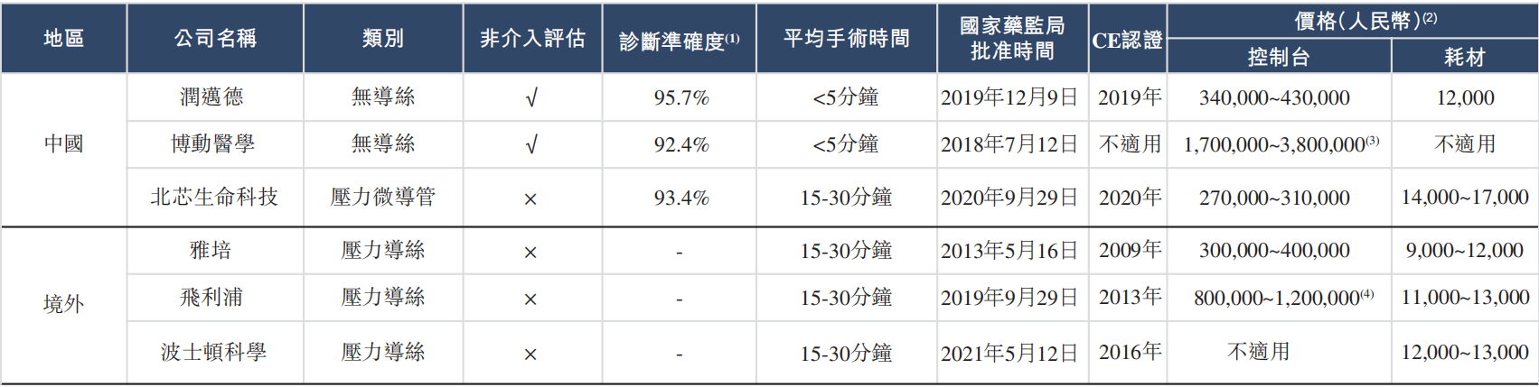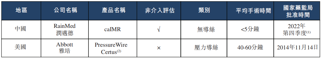 竞争格局方面,共计六家FFR产品公司取得国家药监局的批准,其中润迈德、北芯生命科技、雅培、飞利浦及波士顿科学的产品也都取得CE认证。
