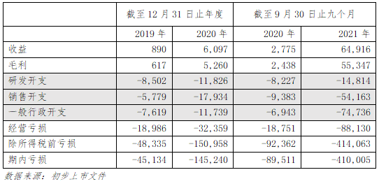 财务数据方面,营收规模相对较小,2019年、2020年以及2021年前九个月的收益分别为:人民币89万元、609.7万元及6491.6万元;销售开支、一般行政开支占营收的比例相对较高,2019年、2020年以及2021年前九个月的销售开支分别为:人民币577.9万元、1793.4万元及人民币5416.3万元,2019年与2020年的销售开支远超营收;净利润亏损幅度加大,2019年、2020年以及2021年前九个月的净利润分别为:人民币-4513.4万元、-1.45亿元、-4.1亿元。