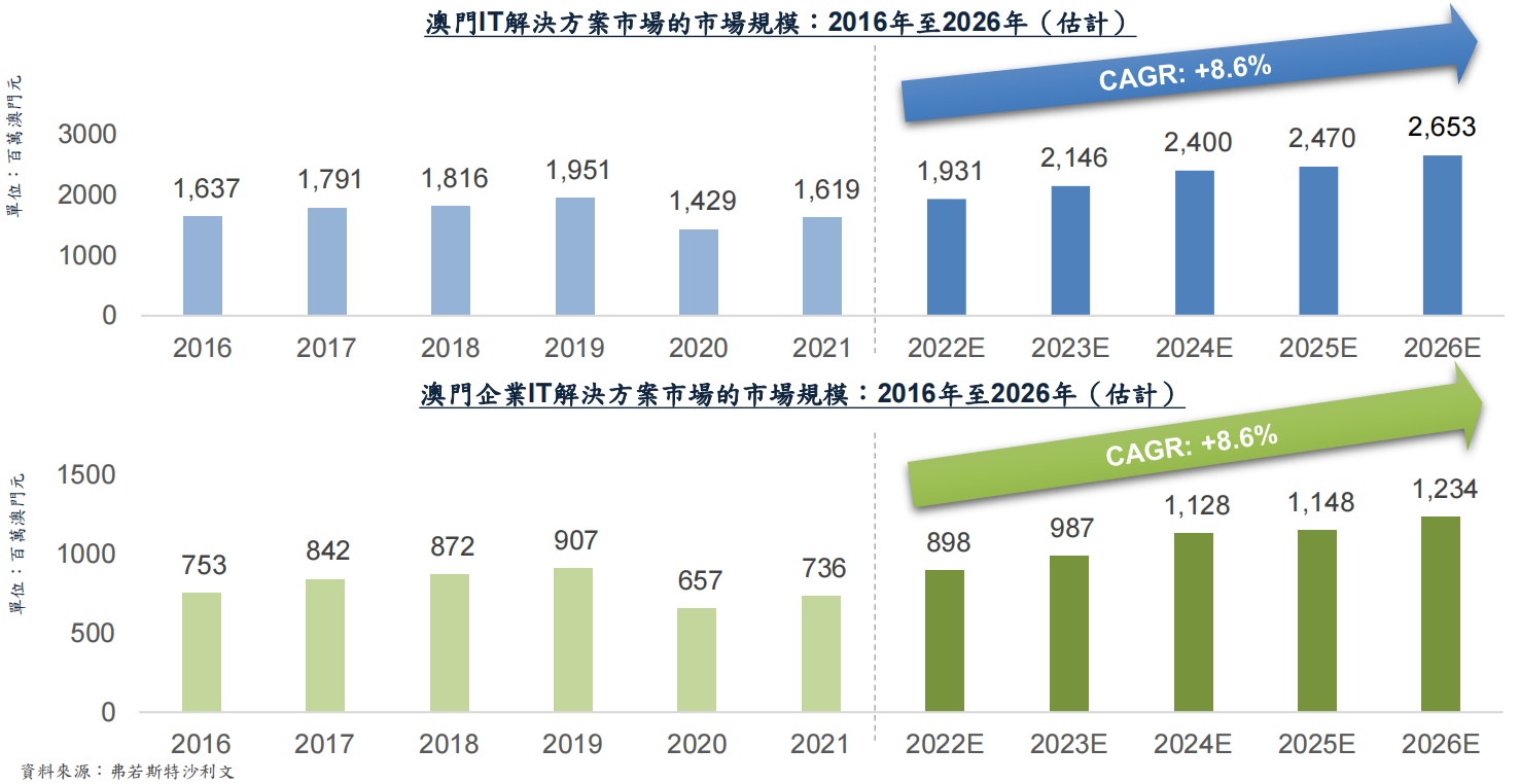 预期澳门企业IT解决方案的市场规模将由2022年的898百万澳门元按复合年增长率约8.6%增长至2026年的1,234百万澳门元。
