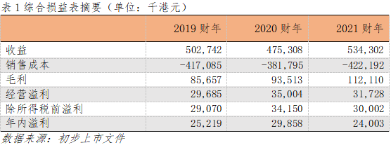 财务数据方面,收入、毛利和毛利率处于缓慢的增长中。于最近三年(2019-2021年),收入分别约为:港元5.03亿元、4.75亿元、5.34亿元,年复合增长率为3.09%;毛利分别约为:港元0.86亿元、0.94亿元、1.12亿元,年复合增长率为14.40%;净利润分别约为:港元0.25亿元、0.3亿元、0.24亿元,年复合增长率为-2.44%;毛利率分别约为17.04%、19.67%、20.98%;净利率分别约为5.02%、6.28%、4.49%。