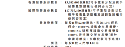 每股招股价为48元至62元,集资最多约81.1亿元,占总市值约11.4%,上市开支约2.449亿元。