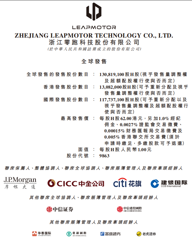9月20日,零跑汽车(09863.HK)在港交所公告,公司于2022年9月20日~9月23日招股,拟全球发售约1.308亿股H股,其中香港发售占10%,国际发售占90%,另有15%的超额配股权,每股发售价为48港元~62港元,预计H股将于2022年9月29日在联交所开始买卖。至此,零跑汽车将成为继“蔚小理”后第四家登陆港交所的“造车新势力”。