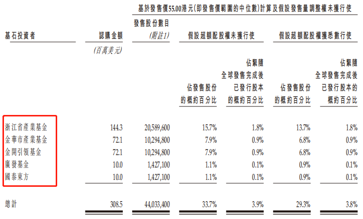 5名基石投资者认购金额合计3.085亿美元,其中浙江省产业基金认购金额1.443亿美元,在基石投资者中认购金额最高;其次是金华市产业基金和金开引领基金,分别认购7210万美元;广发基金和国泰东方分别认购1000万美元。