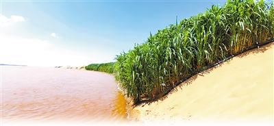 黄河内蒙古阿拉善盟段,河岸种植的菌草起到防风固沙等作用。
