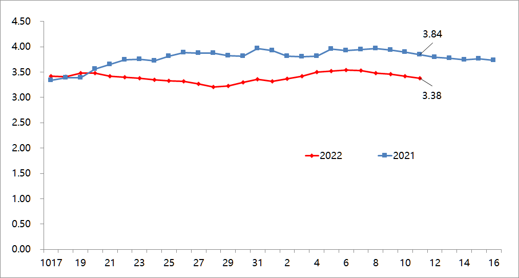从新发地市场11月份第2周的行情分析来看,11日,新发地市场蔬菜加权平均价是3.38元/公斤,比上周(11月4日)的3.50元/公斤下降3.43%;比去年同期的3.84元/公斤下降11.98%。