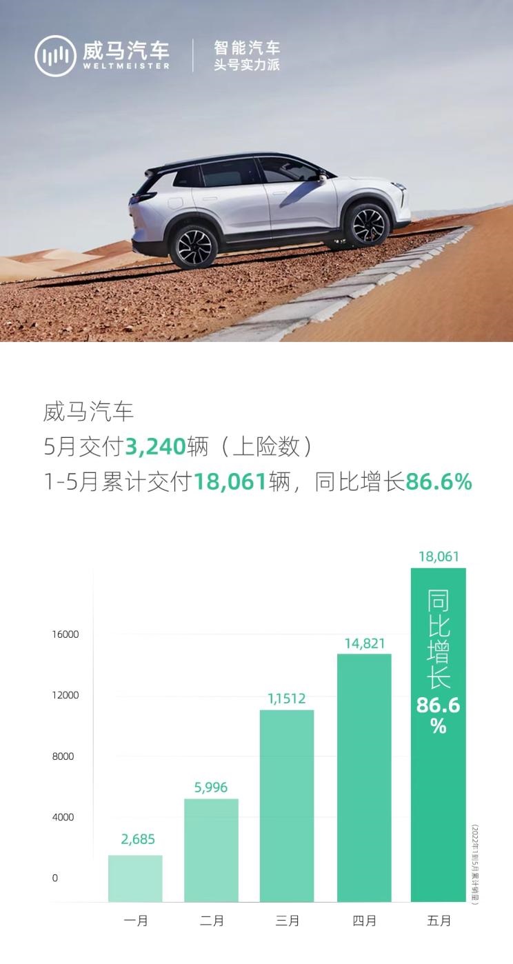 6月15日讯 日前,威马汽车官方公布最新交付情况。数据显示,今年5月,威马汽车交付量为3240辆,环比微降2%。1-5月累计交付18061辆,同比增长86.6%。
