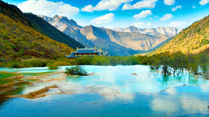 九寨沟位于四川省阿坝州九寨沟县漳扎镇,是白水沟上游白河的支沟,以有九个藏族村寨而得名。海拔在2000米以上,四季景色迷人,被誉为“美丽的童话世界”。景区呈“Y”字形,总长50多公里。沟中分布有多处湖泊、瀑布群和钙华滩流等。水是九寨沟景观的主角,碧绿晶莹的溪水好似项链般穿插于森林与浅滩之间,色彩斑斓的湖泊和气势宏伟的瀑布令人目不暇接。