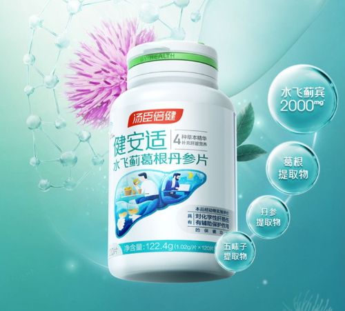 汤臣倍健健安适水飞蓟葛根丹参片每一片含有葛根提取物、丹参提取物、水飞蓟提取物和五味子提取物四种草本精华,可以保肝、护肝、利肝、助肝,每日两次,每次两粒,随时随地为你肝脏保驾护航。