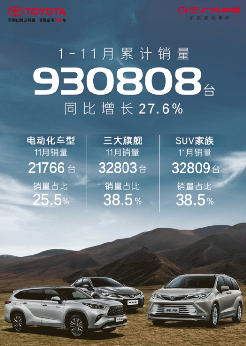 具体来看,旗下电动化车型11月销量21766辆,销量占比25.5%;以凯美瑞、赛那、汉兰达组成的TNGA三大旗舰车型在11月销量32803辆,销量占比38.5%,SUV家族11月销量32809辆,占比38.5%。