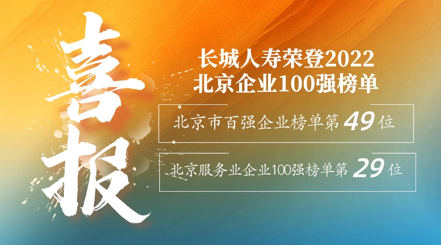 12月22日,由北京企业联合会组织评选的2022北京企业100强名单揭晓,长城人寿保险股份有限公司位列北京市百强企业榜单第49位,同时获评北京服务业企业100强榜单第29位。