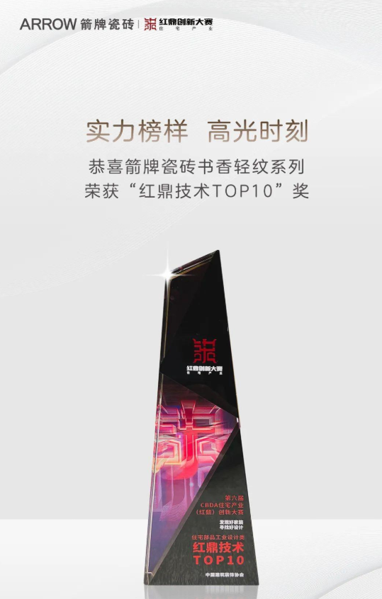 在当晚的红鼎创新大赛颁奖典礼上,箭牌瓷砖书香轻纹系列凭借创新技术一举获得“红鼎技术Top10”奖!