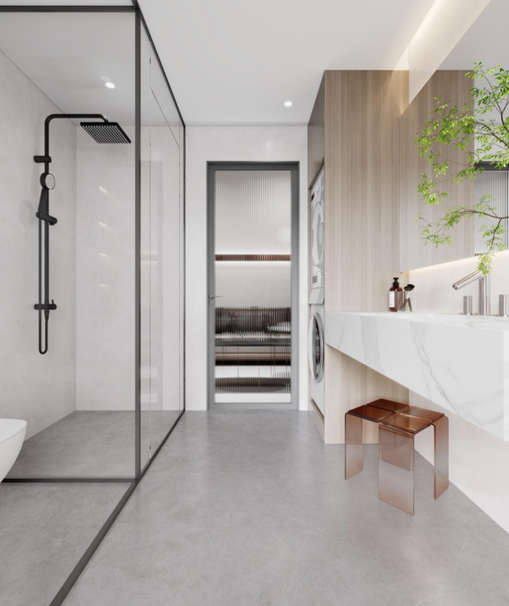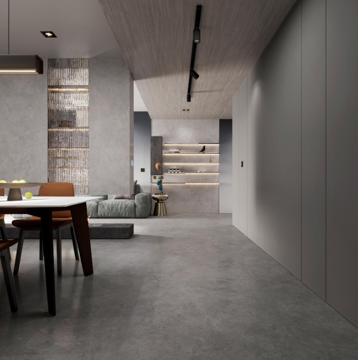 纹理上采用保加利亚石材与洞石叠加的轻纹理,纹理与底色明亮度差≤21阶,形成“三米之外是纯色,一米之内有细节”的特点,整体铺贴简洁素雅,恰到好处的留白为空间呈现最佳背景。