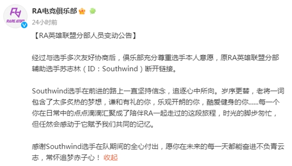 就在昨天,RA电竞俱乐部在官方微博上连续发布两条人员变动的公告,除替补选手bkr离队之外,首发辅助southwind也正式确定离队,以下是RA公告原文:“经过与选手多次友好协商后,俱乐部充分尊重选手本人意愿,原RA英雄联盟分部辅助选手苏志林(ID:Southwind)断开链接。Southwind选手在前进的路上一直坚持信念,追逐心中所向。岁序更替,老将一词包含了太多炙热的梦想,谦和有礼的你,乐观开朗的你,酷爱健身的你……每一个你在日常中的点点滴滴汇聚成了陪伴RA一起走过的这段旅程,时光的脚步匆忙,但任然会感动于它赋予我们共同的记忆。感谢Southwind选手在队期间的全心付出,愿你在未来的每一天都能奋进不负青云志,常怀追梦赤子心!”