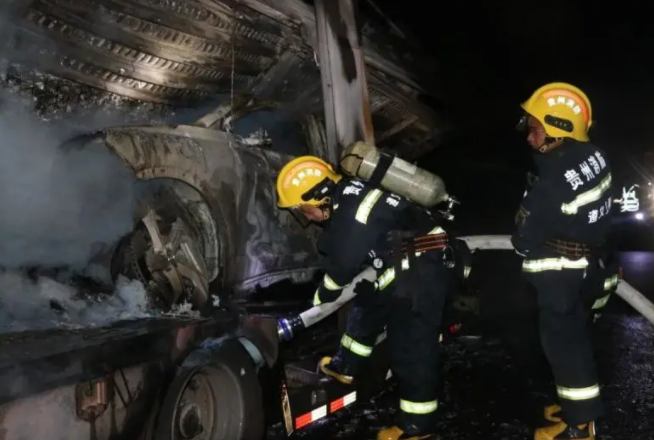 在高速路上,一辆载有8辆进口奥迪的拖车突然起火,由于火势太大,造成6辆车被烧毁,损失达300万元。司机得知车着火后立马打了消防的电话,余庆县白泥路消防救援站接到报警后立即出动处置。