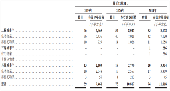 截至2021年12月31日,公司项目74个,在管建筑面积1181.8万平方米,其中,来自余下集团的项目数量为38个,在管建筑面积为657.9万平方米,占比55.7%;来自独立第三方房地产开发商的项目数量为36个,在管建筑面积为523.9万平方米,占比44.3%。