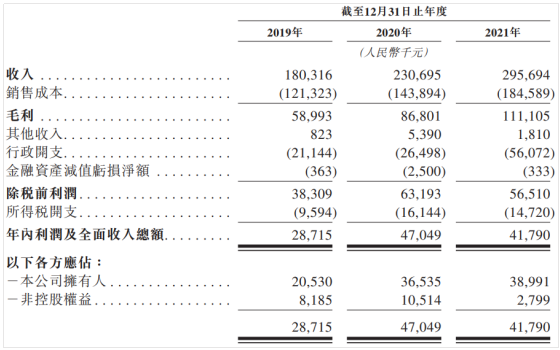 2019年~2021年,公司收入分别为1.80亿(人民币,下同)、2.31亿和2.96亿,毛利润分别为0.59亿、0.87亿和1.11亿,归母净利润分别为0.21亿、0.37亿和0.39亿。