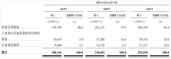 2021年,公司收入2.96亿,其中,来自物业管理服务收入为2.05亿,占公司总收入的69.4%,来自增值服务收入为0.59亿,占总收入的20.0%,来自社区增值服务收入为0.31亿,占总收入的10.6%。
