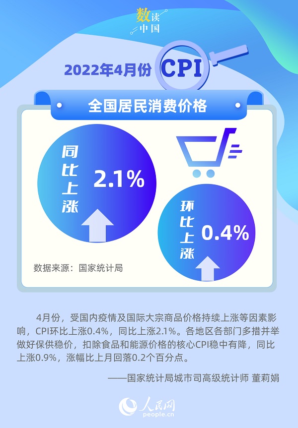 人民网北京5月11日电 (记者杨曦)国家统计局今日发布数据显示,2022年4月份,全国居民消费价格(CPI)同比上涨2.1%,环比上涨0.4%。