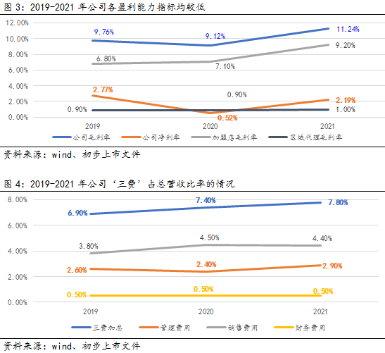 公司2019-2021年收入分别为人民币(下同)89.77亿元、88.56亿元、102.92亿元,2020年、2021年同比分别增长-1.35%、16.21%;同期,经营利润分别为2.25亿元、0.73亿元、2.59亿元,2020年、2021年同比分别增长-67.72%、256.31%;2020年收入放缓主要由于防控疫情措施导致部分门店暂时关闭,居民整体消费能力下降等。2019-2021年,毛利率分别为9.76%、9.12%、11.24%;同期,净利率分别为2.77%、0.52%、2.19%。主要由于超过90%的收入来源于加盟门店或区域代理,贡献的毛利极低。整体盈利能力极弱,如疫情防控持续,整体经济下行趋势未能改观,将对公司影响会非常大。
