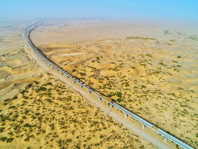 6月16日,新疆和若铁路通车运营,世界首条环沙漠铁路线正式完成“最后一块拼图”。和若铁路与现有格库铁路、南疆铁路“牵手”,共同构成环绕塔克拉玛干沙漠的铁路“闭环”。