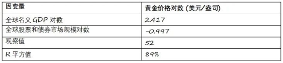长期来看,名义GDP是黄金价格的主要驱动因素,全球股票和债券市场规模则起着部分抵消作用。1971-2022年的年度数据回归分析显示,全球名义GDP与黄金价格呈正相关((系数2.8)),而全球股票和债券市场规模与黄金价格呈负相关((系数-1.0))。R平方值为89%,表明模型拟合度良好。在全球经济保持正增长的预期大背景下,黄金价格仍将受到持续的正向推升。