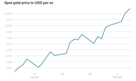 截至2025年2月5日,金价继续保持上涨势头,并创下历史新高。纽约商品交易所4月黄金合约报价高达2,898.61美元/盎司,较前一收盘价上涨0.8%。这一涨幅不仅反映了投资者对避险资产的需求增加,也凸显了当前全球经济环境的不确定性。