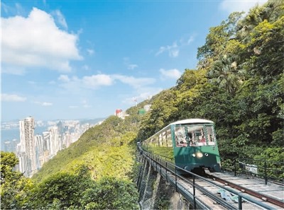 香港山顶缆车在来往中环总站和太平山顶的路上缓缓前进。沿路满山青葱,不时能从婆娑树影之间看到远方的海岸线和群山,以及鳞次栉比的高楼大厦。阳光透过车窗洒落在车厢内,乘客纷纷拿出手机,拍下眼前的景色。