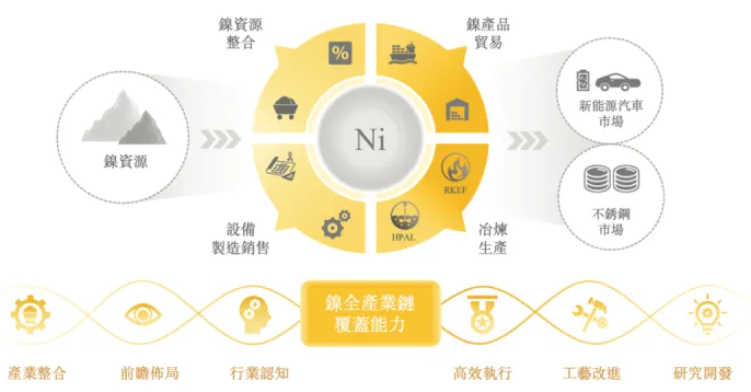 凭借多年积累的深厚行业认知,该公司形成了全面的产品服务体系,业务涵盖上游镍资源采购、镍产品贸易、冶炼生产、设备制造与销售等在内的多个产业环节。该公司不断地向镍行业上下游延伸,完成了对镍产业链环节的垂直整合,产品广泛地应用于新能源汽车、不锈钢行业等下游领域。