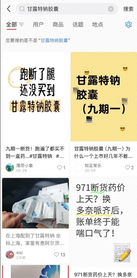 社交平台上患者家属分享的甘露特钠胶囊缺货信息。