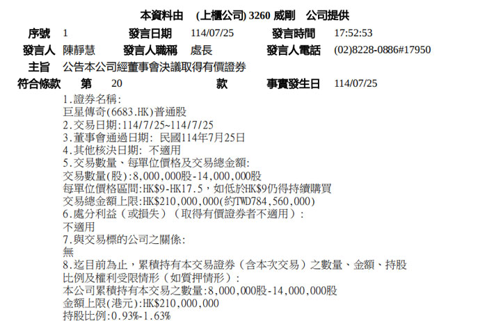 7月25日,全球第二大、亚洲第一大存储器(DRAM)模块及SSD生产商威刚科技公告,经董事会决议取得巨星传奇普通股份,交易数量8,000,000股-14,000,000股,每单位价格区间9港元-17.5港元,持股比例0.93%-1.63%,投资金额上限达2.1亿港元。