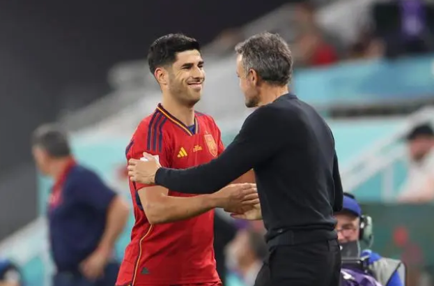 11月23日,西班牙队球员阿森西奥(左)被替换下场后与主教练恩里克致意。
