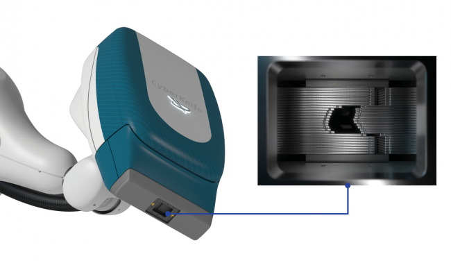 此外,CyberKnife S7配备的InCise 2动态MLC(机器人多叶光栅)系统是其实现高精度、高效率治疗的核心部件。该系统拥有最大100mm×115mm的照射视野与亚毫米级叶片控制能力,可快速适形肿瘤靶区,特别适用于大体积肿瘤,不规则和多发病灶治疗,同时还能有效减少射野数量,提高治疗效率。