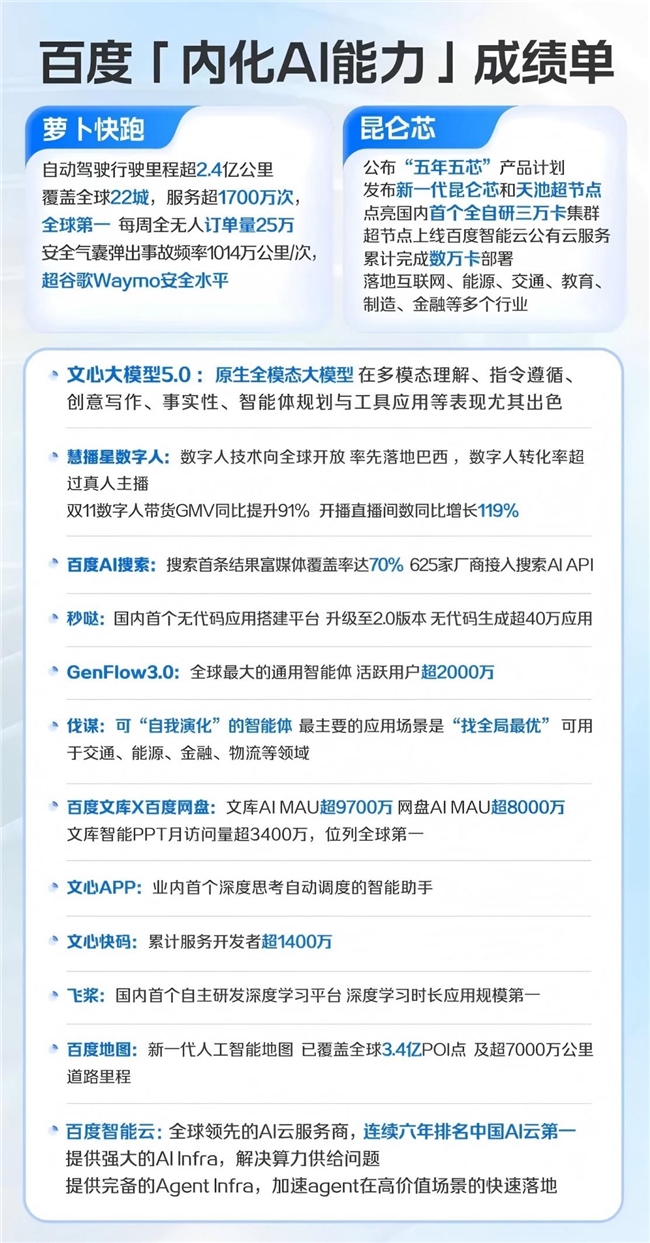 企业想真正用上AI,需要像用电一样,有稳定可靠的“发电厂”和“电网”。百度的解决方案核心在于自研的底层技术栈。首先是“电网”——深度学习框架“飞桨”。它自2016年开源,现已吸引超2300万开发者,服务76万家企业,是国内唯一能与国际主流框架竞争的平台。其次是“发电厂”——自研AI芯片“昆仑芯”。新一代昆仑芯M100/M300及超节点“天池”发布,其中“天池256”能将推理性能提升3.5倍,降低成本。最后是“智能引擎”——文心大模型。最新迭代的文心5.0实现了“原生全模态”,能同时理解并生成文字、图像、视频等内容,在40多项权威评测中已达到全球顶级模型水平。飞桨、昆仑芯、文心大模型的深度协同优化,构成了百度坚实的全栈AI底座。