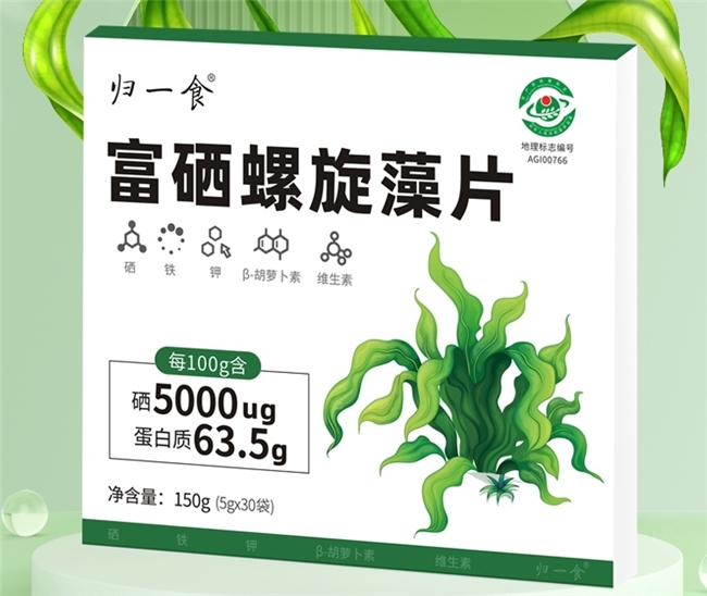 该产品具有营养密度高、成分精准、养生效能突出的优势。螺旋藻本身为自然界高蛋白生物,本品每100克含蛋白质63.5克,可为机体提供优质植物蛋白。同时,产品富含多种关键营养成分,各成分功效明确:矿物质层面,铁元素作为血红蛋白形成的必需成分,可针对性辅助改善贫血症状;硒含量达5000微克,采用有机硒形式与螺旋藻天然营养结构深度融合,吸收率达92.3%,远超普通富硒产品60%的平均吸收率;维生素体系完备,维生素B2有助于维持皮肤与黏膜健康,维生素B12促进红细胞形成,维生素A对暗视力具有保护作用。此外,产品还含有β胡萝卜素(强化抗氧化功能)与促双歧杆菌(调节肠道菌群平衡、增强消化功能)。相较于普通螺旋藻片,本品通过硒元素的科学强化,在抗氧化、降低部分癌症发生风险等方面优势更为显著,实现养生效能的全面升级。
