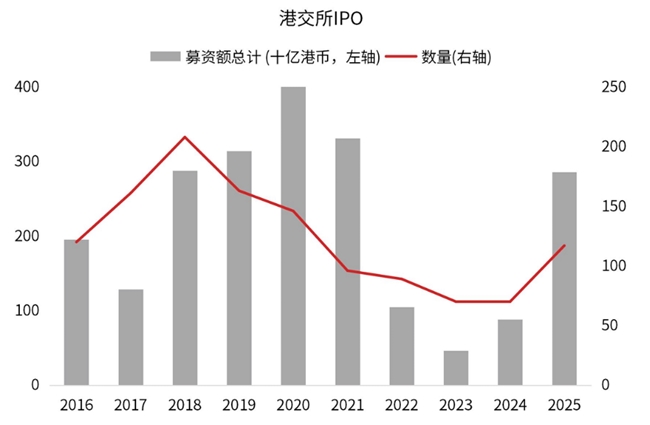 除了市场情绪的修复以外,企业上市融资需求也在提升。截止到2025年底,在港交所上市的企业数量达到117家,自2020年之后再次突破百家增量。而这些在港股IPO的企业中,绝大多数集中在与科技、医药以及新能源等创新领域。这些领域是中国企业参与全球竞争的核心赛场,更便捷的融资渠道和市场将是这些企业更好渡过业务扩张期和技术积累期的关键手段。