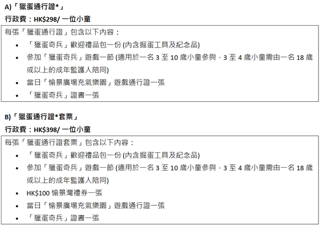 每位參與「愉景灣沙灘獵蛋奇兵」的小朋友須持一張通行證入場。以下為通行證類別及報名詳情: