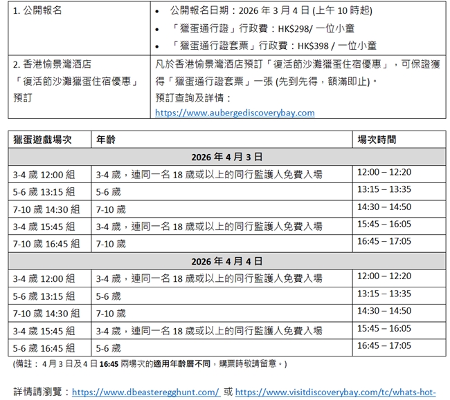 住宿計劃適用於2026年4月2日至4日入住,「獵蛋通行証」適用於2026年4月3日或4日使用。