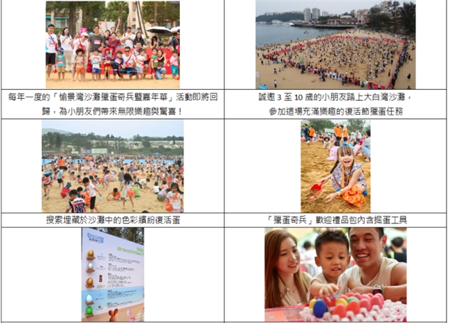 備受歡迎的愉景灣年度親子活動 –「愉景灣沙灘獵蛋奇兵暨嘉年華」將於復活節期間(4月3日至4日)載譽歸來。今年活動邁向第19屆,繼續為小朋友帶來經典的沙灘獵蛋樂趣。活動誠邀3至10歲的小朋友,於大白灣沙灘上搜尋色彩繽紛的復活蛋,換取豐富獎品。大會更特別準備了超過50,000份精美獎品及特別大獎,總值超過港幣100萬元,務求令每一位參與的小朋友都盡興而歸!