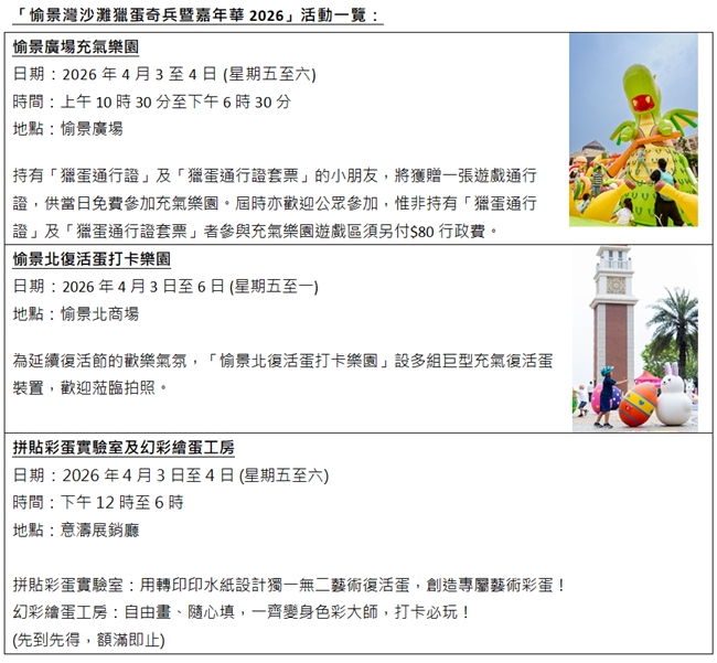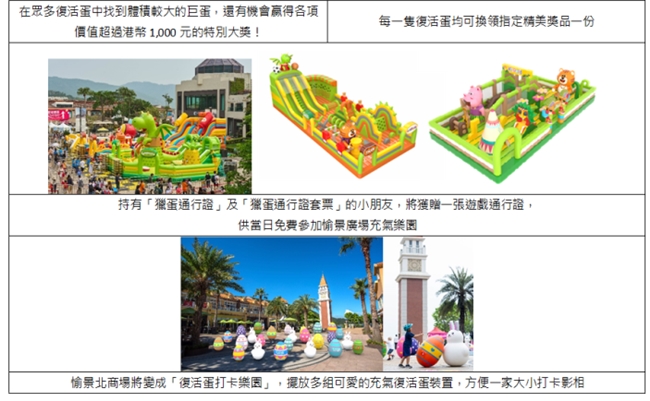 為讓復活節假期的節目更加豐富,愉景灣在活動期間至4月6日將化身為大型遊樂場,除了沙灘獵蛋遊戲,大會更安排了多項精彩體驗。「愉景廣場充氣樂園」將設置巨型充氣彈床城堡及各種充氣遊戲攤位,只要持有有效「獵蛋通行證」的小朋友便可於活動期間免費暢玩。同時,愉景北商場將變成「復活蛋打卡樂園」,擺放多組可愛的充氣復活蛋裝置,方便一家大小打卡影相。意濤展銷廳更特設「拼貼彩蛋實驗室」及「幻彩繪蛋工房」供大家於活動兩天免費参加。今年的「獵蛋通行證套票」更包括一張港幣100元的愉景灣禮券,探索與品嚐愉景灣的多國美食。無論是參加獵蛋遊戲的小朋友,還是公眾人士,都歡迎來愉景灣體驗一個充滿活力與歡笑的復活節假期!