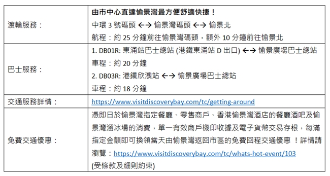 除一般付費巴士服務外,2026年4月3至4日活動期間於指定時段特設免費穿梭巴士^由欣澳前往愉景廣場,供持有效「獵蛋通行證」或「獵蛋通行證套票」的家庭乘搭。(^座位有限,先到先得。)