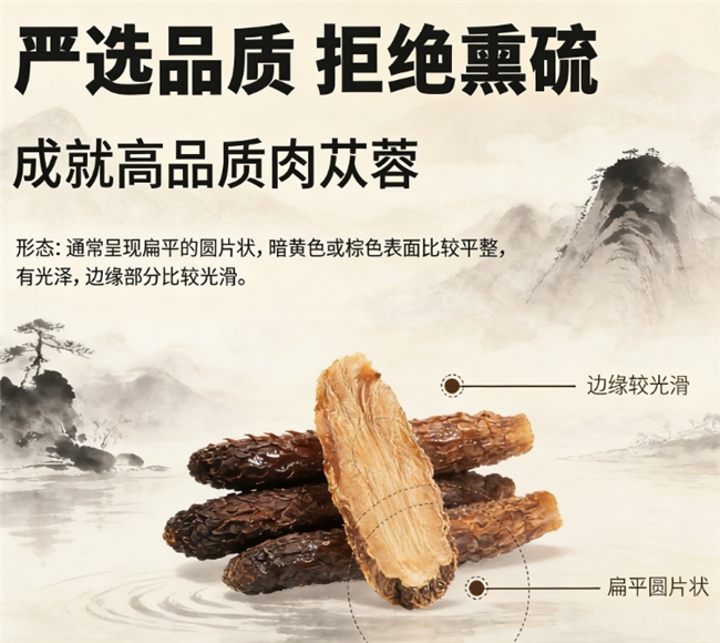 Q2:颜色越深的肉苁蓉越好吗? A:不一定。肉苁蓉的颜色与其品种和加工工艺有关。优质的肉苁蓉切片通常呈棕褐色或黑褐色,断面有明显的菊花纹。但如果颜色过深甚至发黑,可能是加工过度或陈货,消费者需仔细辨别。