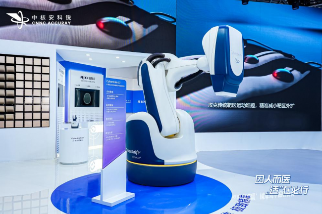 中核安科锐长期深耕高端放疗领域,展出的另一款“明星产品”——AI放疗机器人CyberKnife S7继承了射波刀家族“全向聚焦、极致精准、如影随形”的三大核心基因,搭载全新KUKA机器人平台,实现0.06毫米空间精度与超过6000个空间入射角度,配合独有的机器人多叶光栅、可变孔径准直器与VOLO极速优化引擎,可大幅缩短治疗时间,为大体积、不规则形状肿瘤的治疗开辟了新路径。